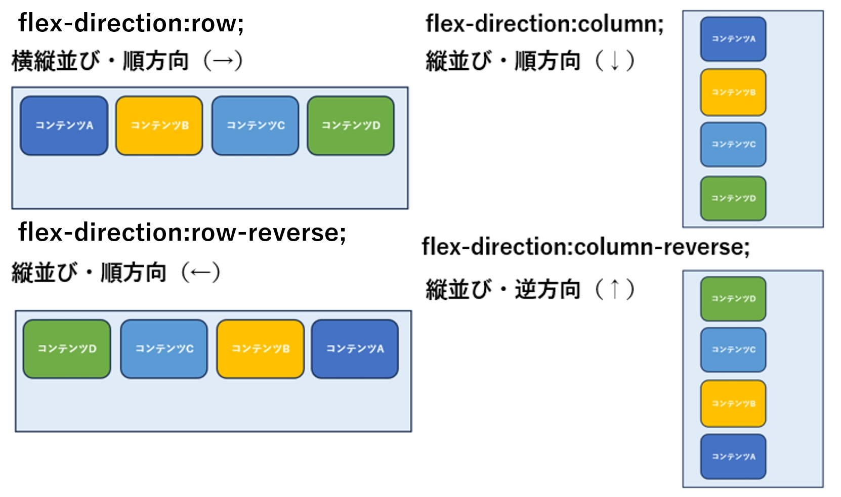 | flex-direction | アイテム(子要素)の並び順を指定する | row(デフォルト) row-reverse column column-reverse | 横並び・順方向に配置 横並び・逆方向に配置 縦並び・順方向に配置 縦並び・逆方向に配置 |
