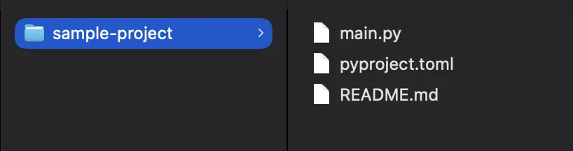 uv init sample-projectInitialized project `sample-project` at `/Users/User/Desktop/sample-project`また、作成されたディレクトリ内には、自動でいくつかのデフォルトファイルが用意されています。